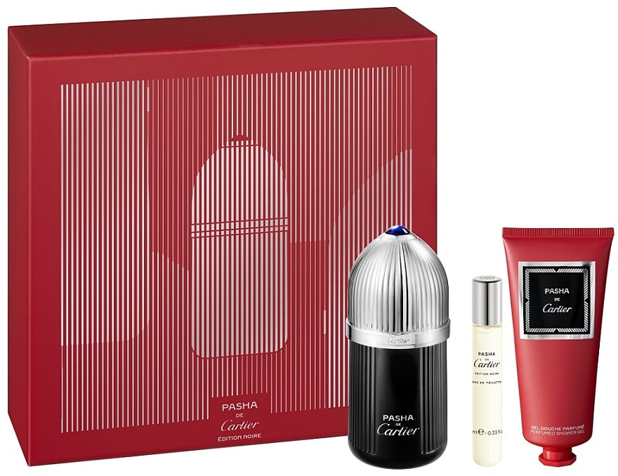 Elegant Cartier fragrance discovery set with festive decoration for you or your loved ones. This set contains a 100 ml Eau de Toilette, a 10 ml Purse Spray and a 100 ml Perfumed Shower Gel from the Pasha de Cartier Edition Noire collection.