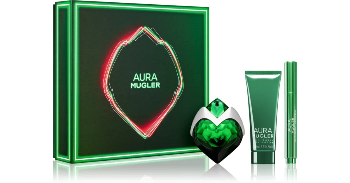 Aura Mugler by Mugler is a luxurious Amber fragrance for women, containing top notes of Rhubarb Leaf, Bergamot, and Green Notes, as well as middle notes of Orange Blossom, Ylang-Ylang, and Pear. A blend of Bourbon Vanilla, Woody Notes, Amberwood, Sandalwood, and Coumarin creates a warm, sensual base. Gift set includes 30ml Perfume, 50ml Body Lotion, and Perfume Brush. Ideal for all occasions.